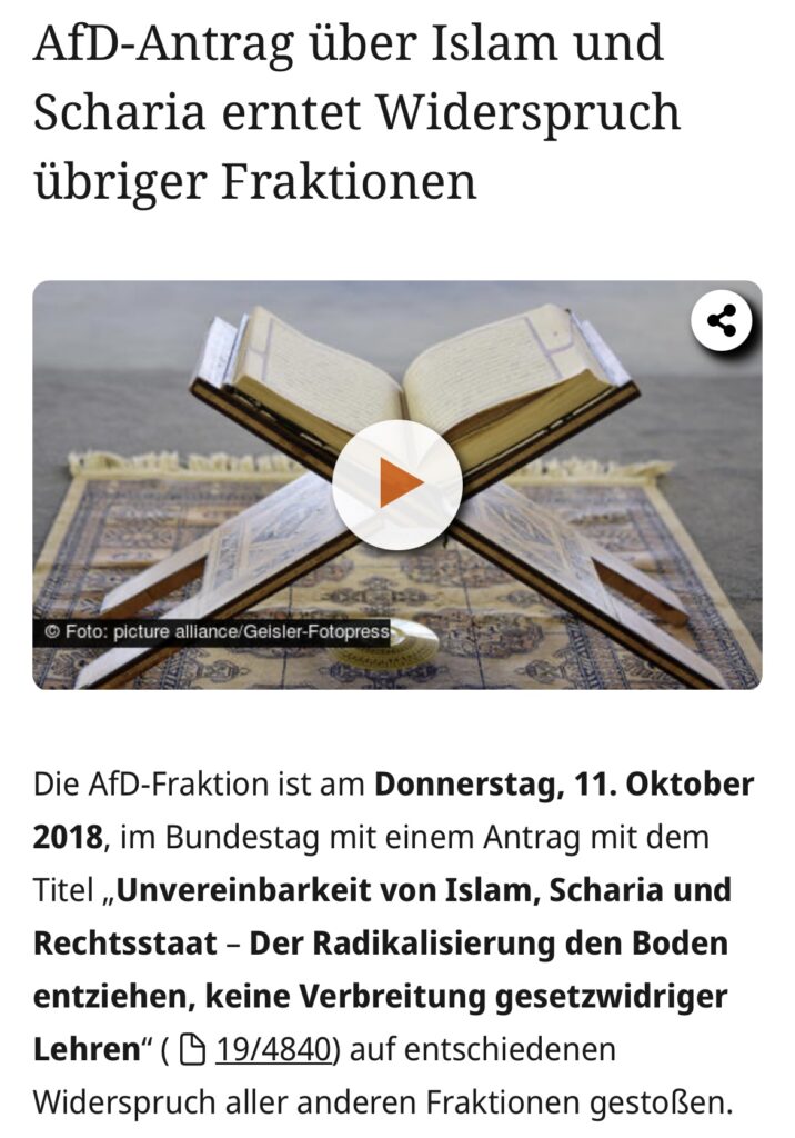 Aber was ich fand, war dies: „Verfehlte Migrationspolitik und Asylmissbrauch haben zum 100.000-fachen Import von Menschen aus zutiefst rückständigen und frauenfeindlichen Kulturen geführt.“ So lautete nach Verfassungsschutz-Angaben ein Tweet eines AfD-Mitarbeiters im Deutschen Bundestag. Er hat den Tweet mittlerweile gelöscht. Ist diese Aussage wirklich so schockierend, dass das ganze deutsche politische Establishment jetzt über ein Verbot diskutiert?