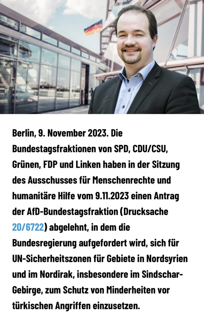 Eine solche Schutzzone ist elementar, um die Sicherheit von Minderheiten in diesem Gebiet zu gewährleisten. Immer wieder fliegt die Türkei Angriffe in dieser Region und immer noch sind im Nordirak jesidische Mädchen als Sexsklavinnen verschleppt. Nur mit der Errichtung einer UN-Schutzzone kann dort ein sicheres Leben für Minderheiten wie die Jesiden ermöglicht werden. Dass alle anderen Fraktionen sich dagegen sträuben, eine sichere Heimat für die Jesiden im Nordirak zu schaffen, halte ich für unverantwortlich, vor allem, weil alle Fraktionen Anfang des Jahres den Völkermord an den Jesiden anerkannt und dieser verfolgten Minderheit Unterstützung zugesagt haben. Es ist bedauerlich, dass offensichtlich die AfD-Fraktion als einzige Fraktion im Bundestag dazu bereit ist effektiv echte Fluchtursachen zu bekämpfen.“