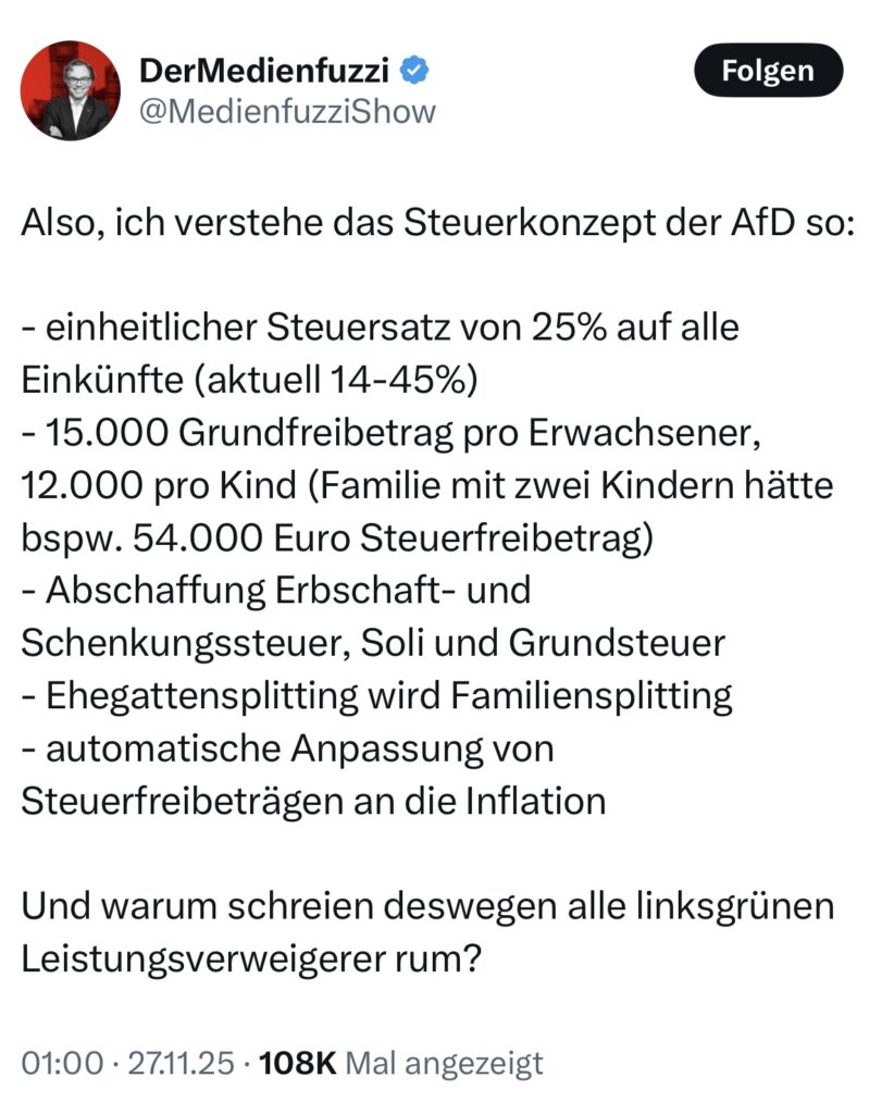 Oder ist es die Angst, dass Abtreibung nicht bis kurz vor der Geburt erlaubt sein, das Volk mehr Mitspracherecht in Form von Volksabstimmungen nach Schweizer Modell haben, dass Steuerverschwendung ein Straftatbestand werden, dass die Nationalstaaten wieder mehr Mitspracherecht in der EU erlangen, dass Staatsanwälte und Richter weisungsfrei sein, die Ukraine nicht mehr unterstützt werden, die Pflege durch Angehörige aufgewertet werden, die Zugehörigkeit des Islams zur deutschen Kultur verneint werden oder dass sich Arbeit und Leistung wieder lohnen und damit die Abwanderung von Firmen verringert werden könnte?
