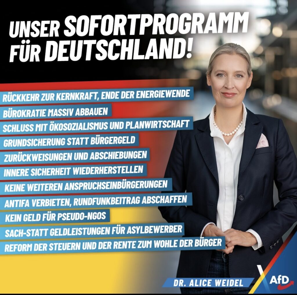 Ist es denn als demokratiefeindlich zu sehen, dass die AfD das Heizungsgesetz kippen, die Einwanderung illegaler Migranten stoppen, die CO2-Abgabe zurücknehmen, das Abholzen der Wälder für Windräder unterbinden, das Gendern verbieten, die traditionelle Familie in den Vordergrund stellen und die Diskriminierung von Vollzeitmüttern stoppen, Geschlechtsumwandlungen erst ab Volljährigkeit erlauben, Bandenkriminalität zerschlagen, Korruption härter bestrafen und den ÖRR wieder zu einem neutralen Organ führen könnte?