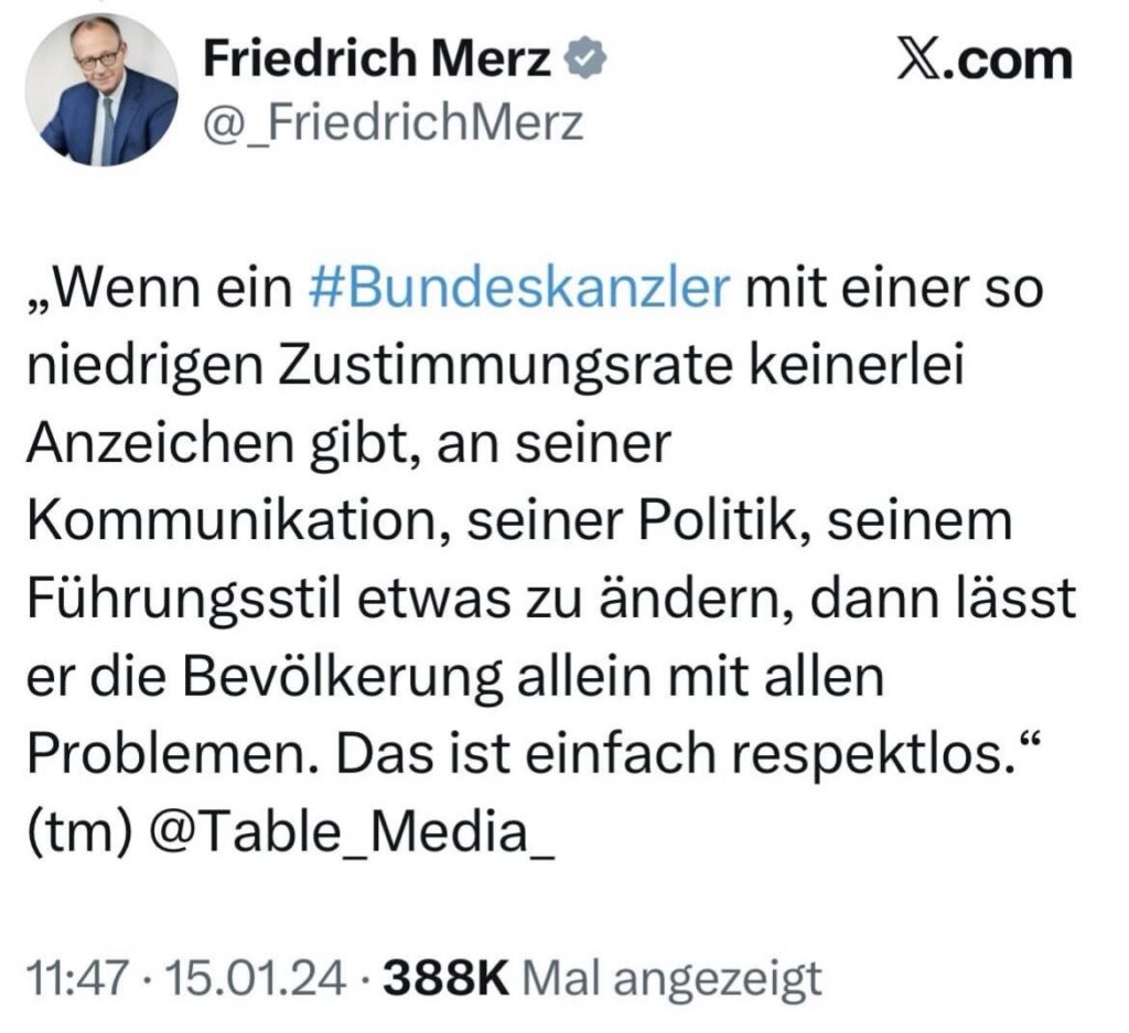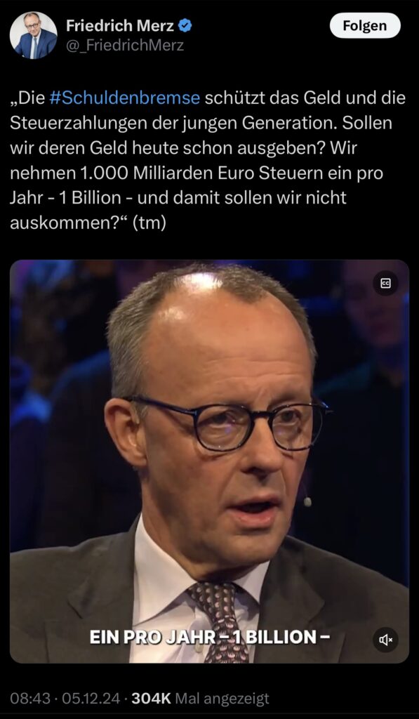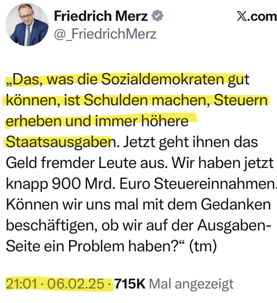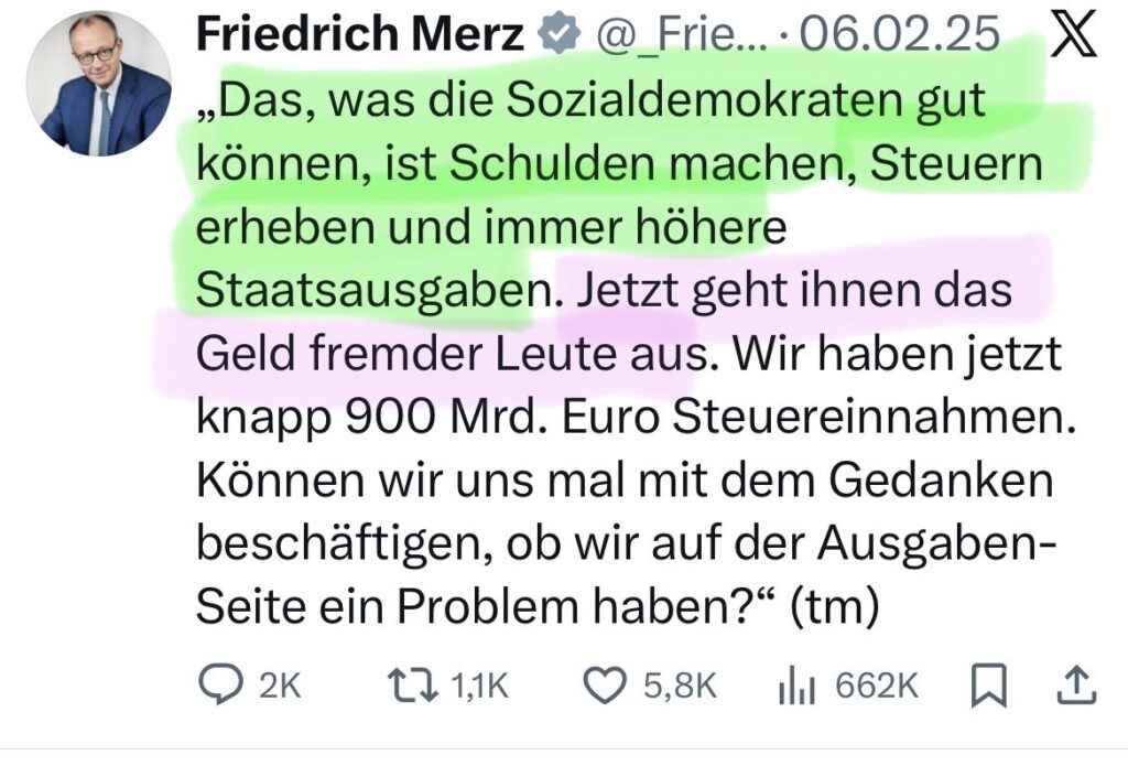 Und damit hat er recht. Was treibt diese. Regierung an, was treibt Friedrich Merz an, das Zerstörungswerk der Ampel derart verbissen und uneinsichtig weiterzuführen? Jeder, der noch einen Funken Verstand besitzt, fragt sich, was man Herrn Merz eigentlich noch glauben kann?